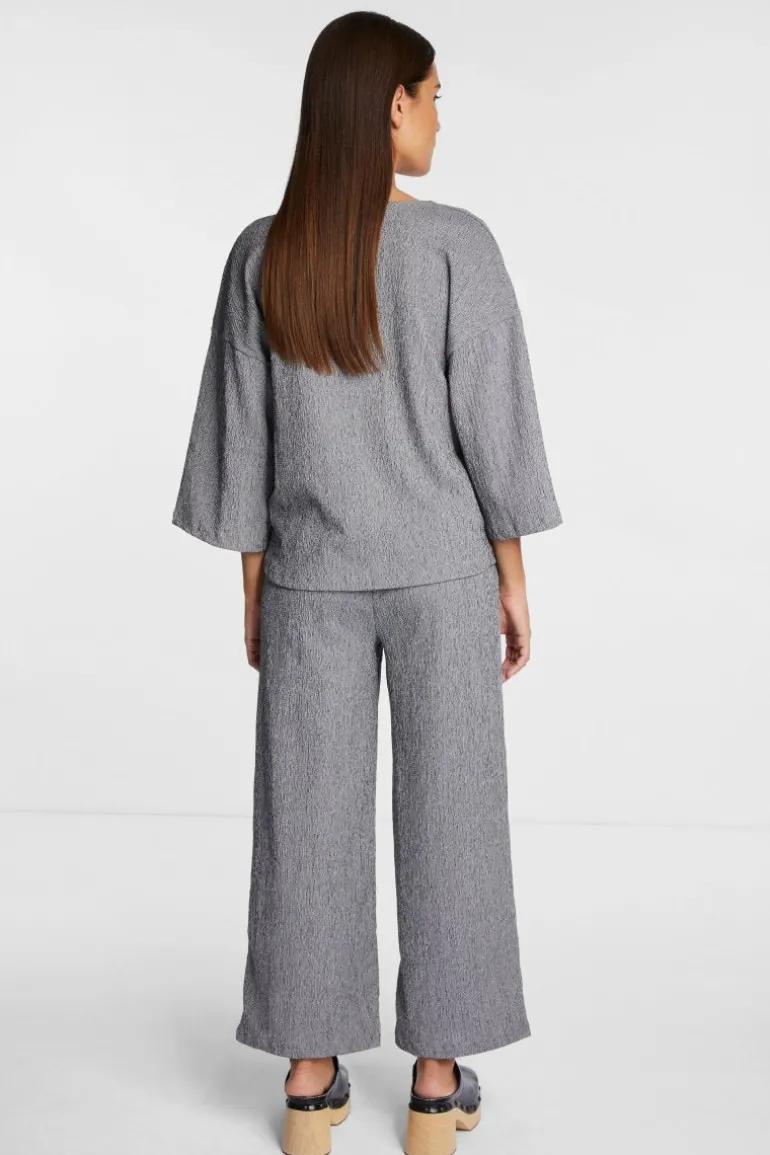 Das zweifarbige Kreppmaterial der Pants bringt ein ausdrucksstarkes Gesamtbild. Trendig präsentiert sich die Hose auch mit ihrem weiten Bein. Dank des Gummibundes und der Taschen trägt sie sich recht bequem.
