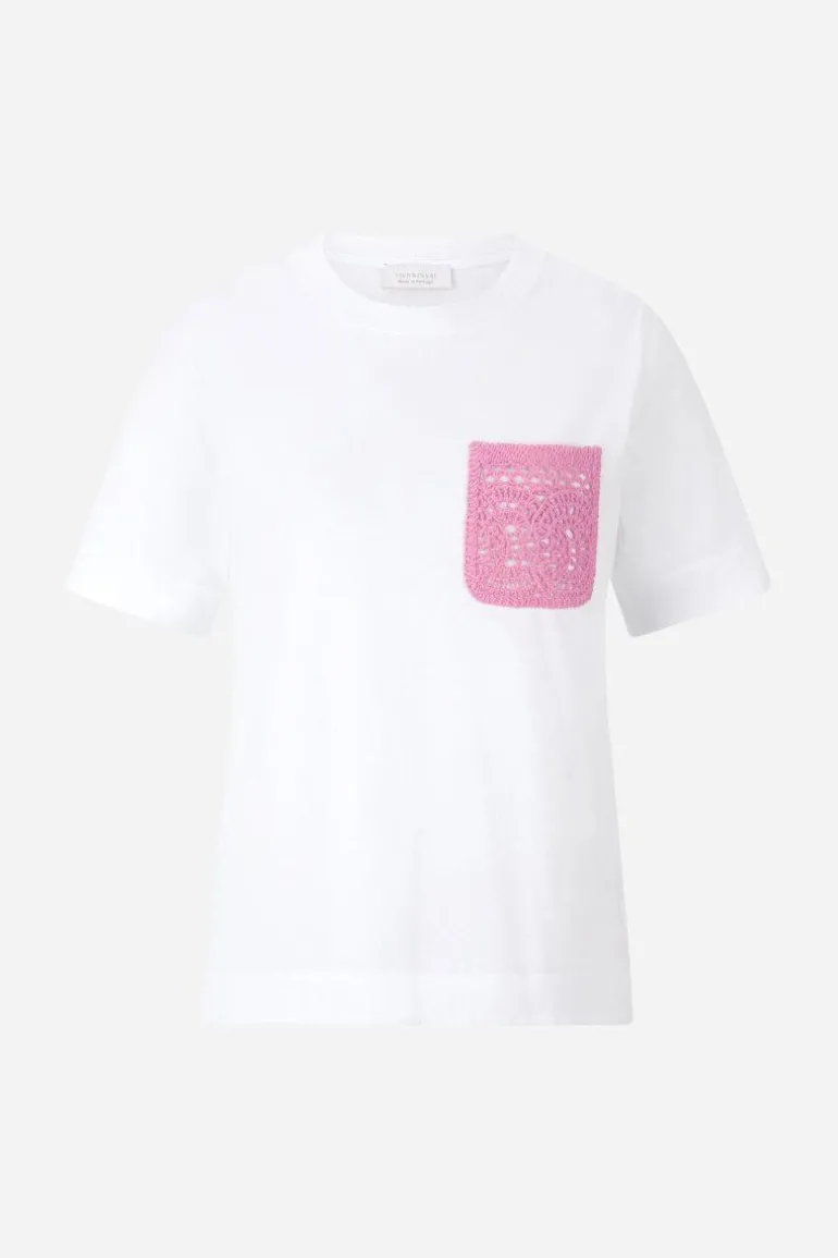 Dieses weiße T-Shirt mit lockerem Fit und klassischem Crew-neck wird durch die aufgenähte Crochet-Tasche in Pink zum verspielten Stilhighlight. Wir kombinieren es am liebsten zu einer Stoffhose für einen eleganten Casual Look.