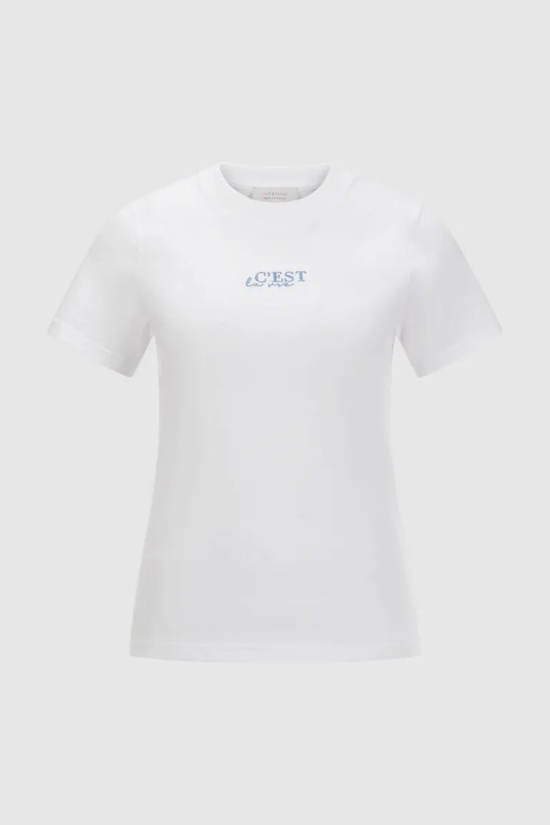 Dezent setzt sich bei diesem T-Shirt das strassverzierte „La vie est belle“-Statement in Szene. Ansonsten präsentiert sich das Basic minimalistisch im Bodycon-Fit mit Rundhals und Viertelarm. Gefertigt mit organischer Baumwolle und Elasthan trägt es sich äußerst komfortabel.